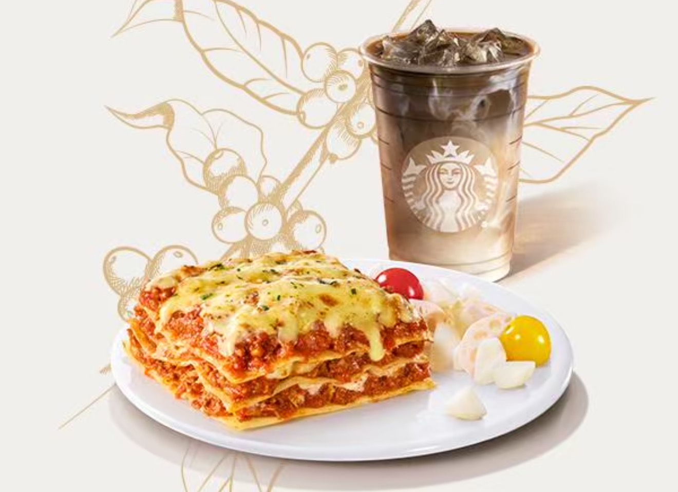 冰加浓焙茶拿铁(大杯)+牛肉意式千层面