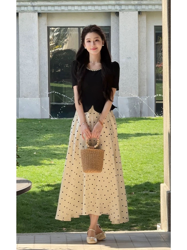 LILI李李家【罗马日记】法式赫本风波点连衣裙2026夏新品撞色长裙